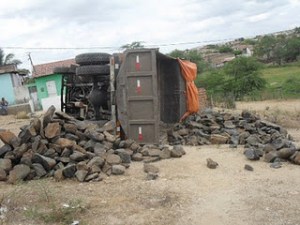 Por volta das 08h00minh desta sexta-feira (13/01) uma caçamba Chevrolet de placas MZG-0491, conduzido por CLIDENOR FERREIRA MACEDO, 54 ANOS tombou numa Rua durante o descarrego de uma carrada de pedras. O motorista disse que subiu a caçamba e começou a descarregar quando a carga pendeu e tombou o caminhão.O motorista teve apenas escoriações leves.