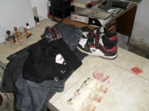 Nego alega que é viciado em crack e sempre que bebe costuma furtar para manter o vício e que já foi detido outras vezes. Ele vestia as peças de roupa que furtou e estava com R$- 160,00 a caminho de uma boca de fumo.