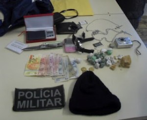Com JOÃO PAULO DOS SANTOS DE 25 ANOS MAIS CONHECIDO COMO BOB ESPONJA foi apreendido aproximadamente 230 gramas de crack, 01 balança de precisão, 01 máquina fotográfica, 02 relógios, R$-93,00 e notas fracionadas e 01 canivete.