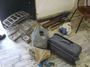 Com o outro detido, MANUEL MEDEIROS DE OLIVEIRA DE 20 ANOS, foi apreendido: 04 espingardas tipo bate bucha, cerca de 200 cds e dvs piratas e 02 gaiolas com pássaros silvestres.
