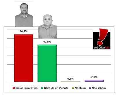 Segundo números do Agorasei, Junior foi citado por 54,8% dos entrevistados na intenção de voto estimulada. Titico obteve 42.8% e os indeciso e nulos somam apenas 2.4%.