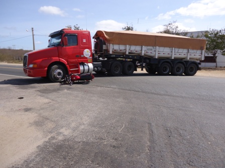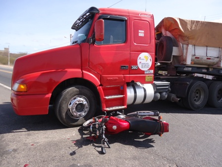 Na manhã desta Sexta-feira de 02 de novembro, na BR 405, no trevo que da acesso a Currais Novos e São Vicente, Uma carreta Volvo, de placas DWT 2718, dirigido por Cristovão da Silva Lopes, 28, residente Rua Peru, 11, Fortaleza, colidiu lateralmente com uma moto YBR de cor vermelha, de placa MYP 8721, pilotada por Francisco de Assis de Araujo, residente na Rua Riacho Salgado, 11, Currais Novos.
