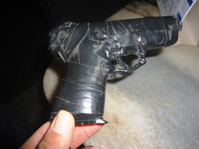 Poucos minutos depois, a Policia Militar já sabia a qualificação dos dois, e localizou uma arma de plástico, totalmente coberta por fita isolante. Eles são do mesmo bairro, e terão os nomes entregue a justiça para ser tomada providencias.