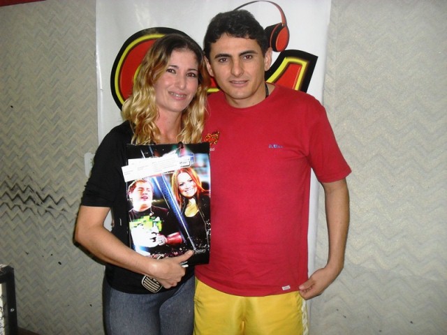 Na foto está Suely Oliveira, que ganhou na promoção do jogo Brasil x Espanha, com a equipe do Bate Bola, recebendo KIT do Aviões do Forró, e claro, sorrindo atoa.