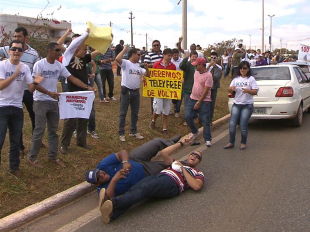Manifestantes que apoiam a empresa Telexfree fecharam os acessos ao Aeroporto Internacional Juscelino Kubitschek, em Brasília, na manhã desta terça-feira (23), causando transtornos a passageiros e a motoristas que passam pelo local. A empresa é suspeita de montar um esquema de pirâmide financeira.