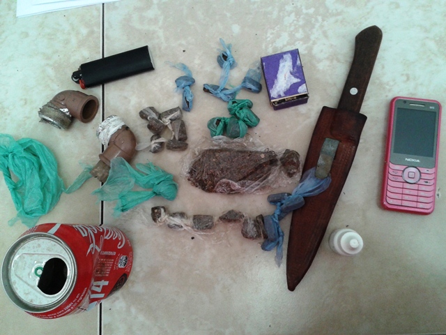 Na abordagem foi localizado 01 arma branca, maricas para usar droga, 01 celular, e 26 trouxinhas de maconha, além de 01 tablete maior, que seria para fracionar, e possivelmente vendido.