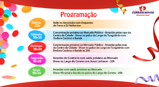 Carnaval Currais NovosOs tradicionais festejos carnavalescos estão ressurgindo em Currais Novos com a iniciativa de produtores culturais, artistas, e empresários locais. Nesta sexta-feira (28), a partir das 22h, será dado o ponta pé inicial para o Carnaval na terra da scheelita com baile no Aero Clube com Orquestra de Frevo e Dj Nalkerson. Mas, a programação será bastante diversificada até a próxima terça-feira (04), com diversas atrações e arrastões pelas ruas da cidade. Confira a programação completa do Carnaval de Currais Novos: