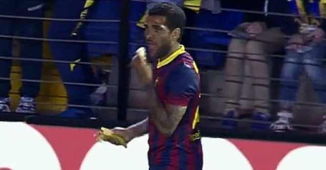 daniel-alves-banana-692x360Mais um caso de racismo na Espanha fez com que um brasileiro tomasse uma atitude inusitada. Durante a vitória do Barcelona sobre o Villareal, por 3 a 2, no domingo, o lateral-direito Daniel Alves comeu uma banana jogada por um torcedor na arquibancada, no intuito de parecer uma ofensa racista.