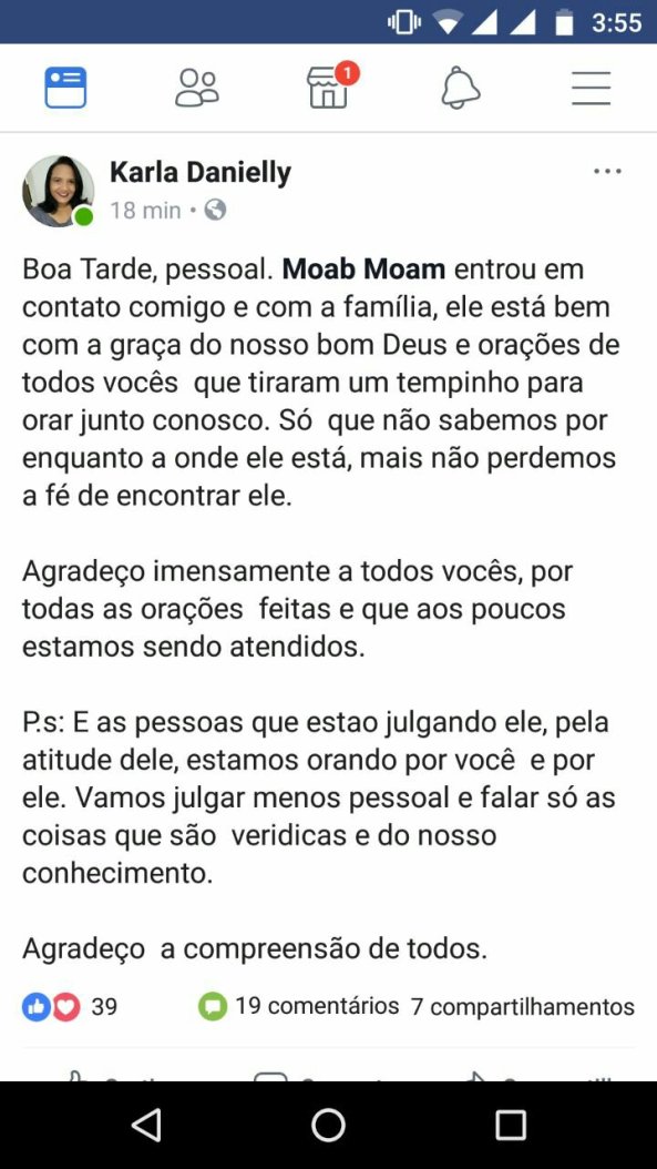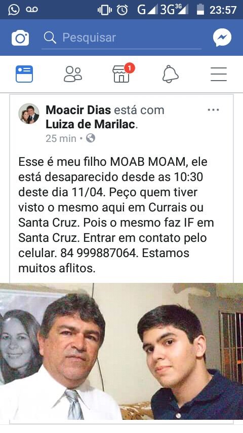 Desde a manhã desta quarta (11), que permanece desaparecido o jovem Moab Moam. Ele saiu para o IFRN de Santa Cruz e não apareceu ainda. Quem tiver informações ligar para o 99887064. A família está aflita…