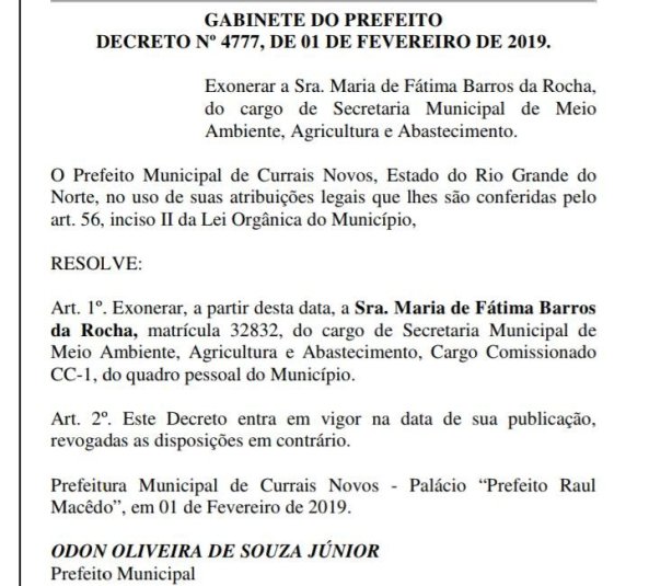 Maria De Fátima Barros da Rocha, Secretária Municipal de Meio Ambiente, Agricultura e Abastecimento, teve sua exoneração publicada no Diário oficial do município de Currais Novos do último primeiro de Fevereiro.