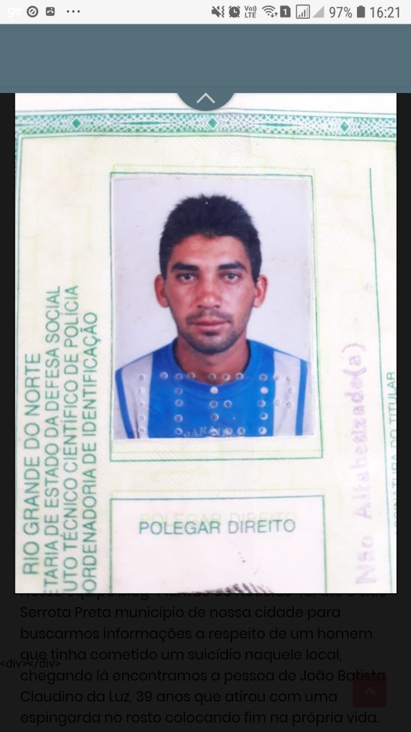 Um cidadão atirou na propria cabeça, usando uma espingarda, na manhã deste Domingo (16) no sítio Serrota Preta município de Currais Novos. João Batista Claudino da Luz, 39 anos, conhecido por Batista, era dependente de álcool e desde a adolescência que já tinha problemas. Ele havia passado um período internado mas dias atrás voltou a beber e acabou cometendo este ato extremo.