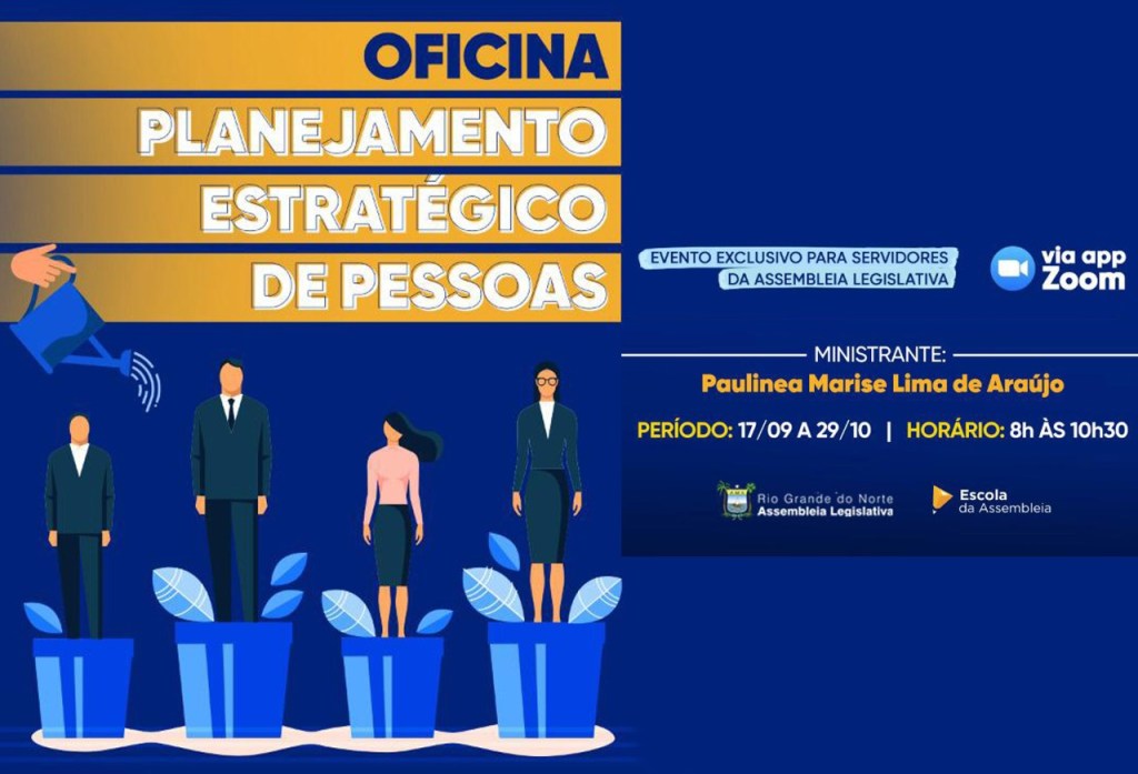 A Oficina Técnica “Planejamento Estratégico de Pessoas da ALRN” tem a liderança de Paulinéa Araújo, que é Consultora em estratégia, gestão de projetos e processos, além de Coordenadora de Auditoria Interna da Justiça Eleitoral, e tem carga horária de 20h, divididas entre os dias 17 de setembro e 29 de outubro de 2020.