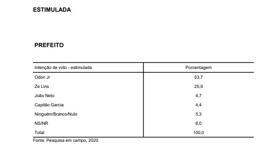 Na sondagem estimulada o prefeito Odon Júnior (PT) tem 53,7% da intenção de votos do eleitorado. Seguido por Zé Lins (MDB) com 25,9%, João Neto (PP) 4,7%, Capitão Garcia com 4,4%. Ninguém/Branco/Nulo 5,3%, Não sabem ou Não Responderam 6,6%.