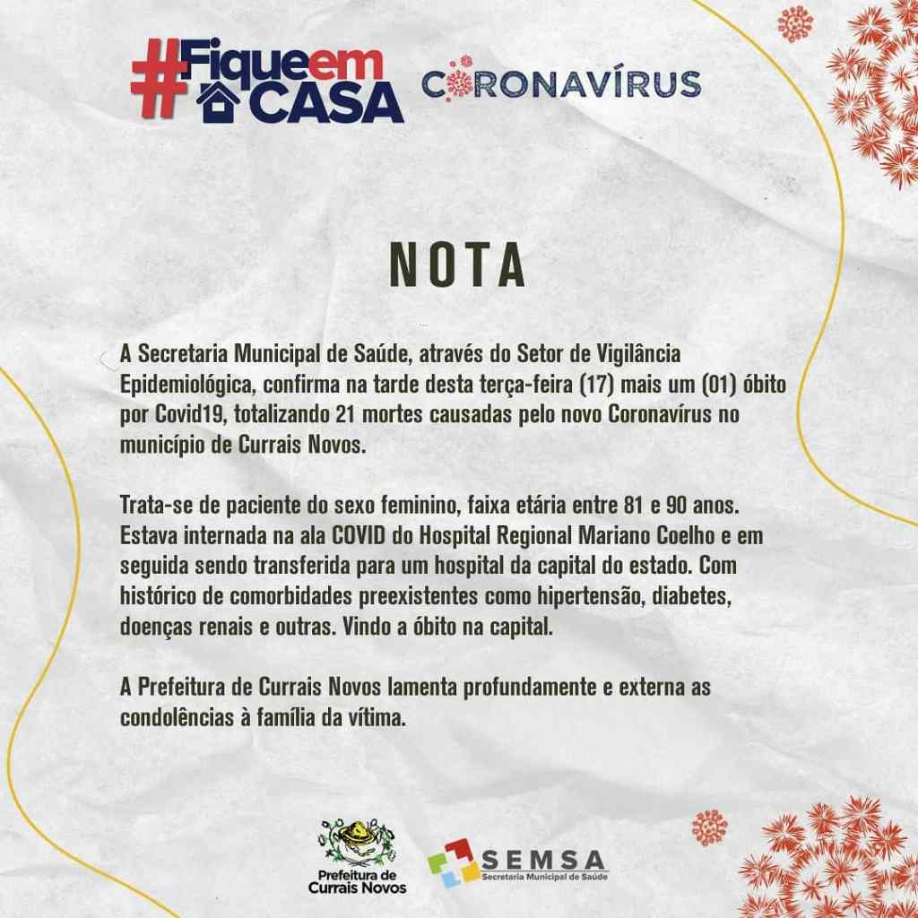 A Secretaria Municipal de Saúde, através da Vigilância Epidemiológica, confirma na tarde desta terça-feira (17), mais oito (08) novos casos, totalizando 944 casos de Covid19 e, infelizmente, o 21º óbito no município de Currais Novos.