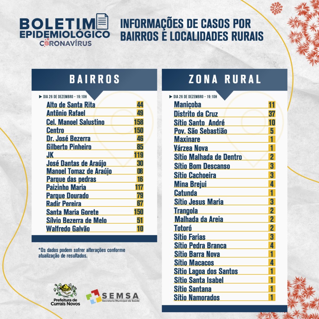 A Secretaria Municipal de Saúde, através da Vigilância Epidemiológica, confirma na noite deste sábado (26), mais nove (09) novos casos, totalizando 1263 casos de Covid19 no município de Currais Novos.