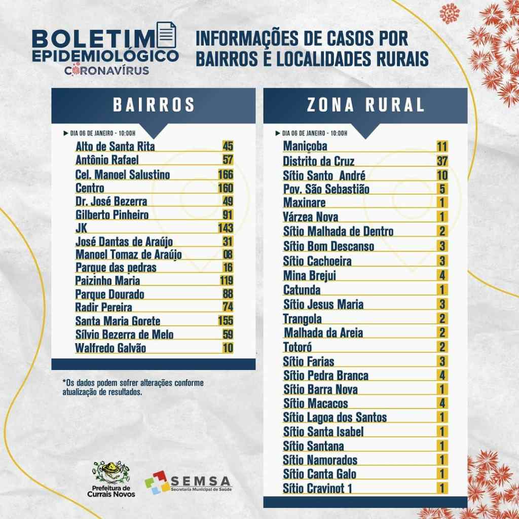 A Secretaria Municipal de Saúde, através da Vigilância Epidemiológica, confirma manhã desta quarta-feira (06), mais vinte e três (23) novos casos, totalizando 1358 casos de Covid19 no município de Currais Novos, ressaltando que esses novos casos são referentes ao acumulado dos últimos 3 dias.