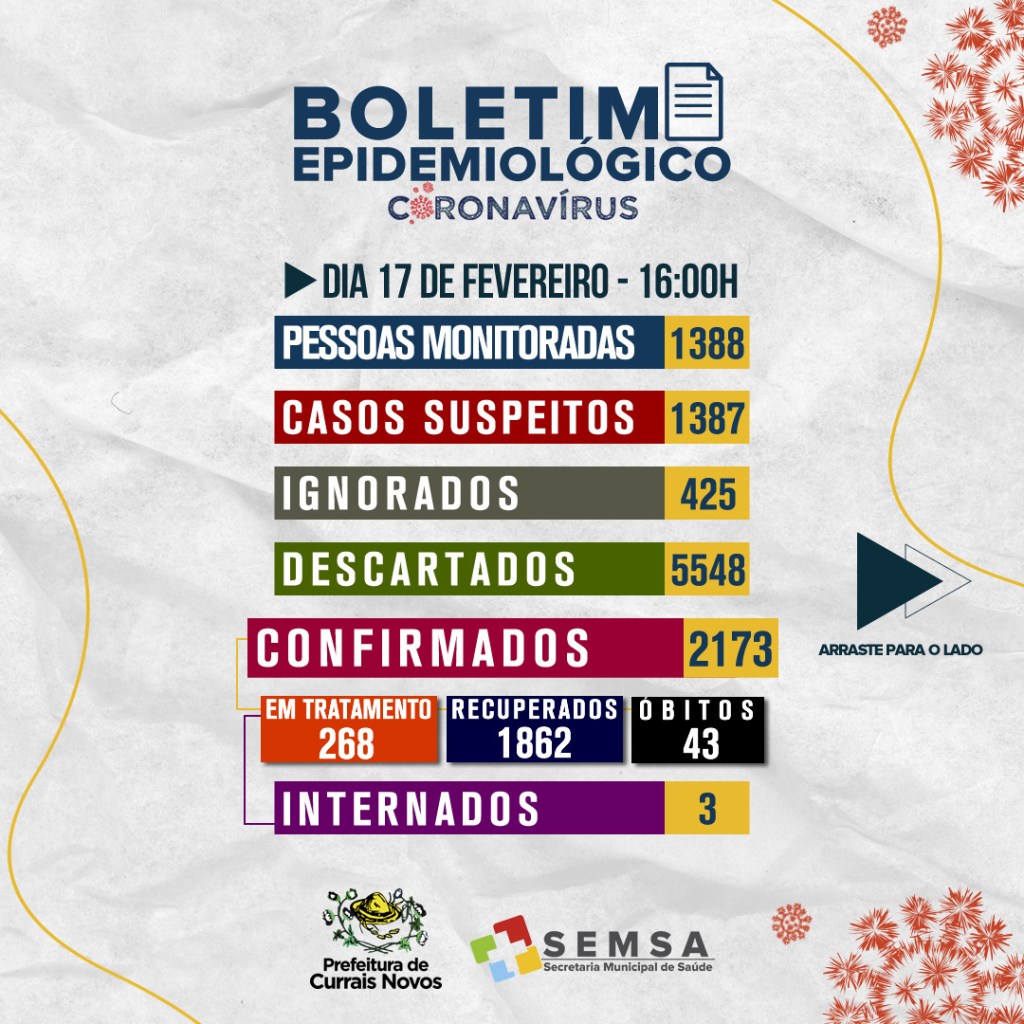 A Secretaria Municipal de Saúde, através da Vigilância Epidemiológica, confirma na tarde desta quarta-feira (17), mais quinze (15) novos casos, totalizando 2173 casos de Covid19 no município de Currais Novos.