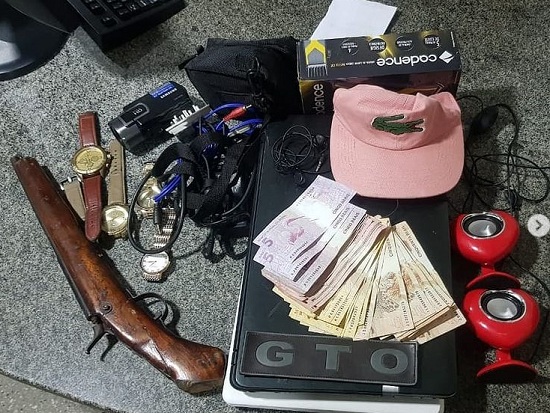 Um roubo a mão armada foi registrado na noite de ontem (15/02/21), na pacata cidade de São Vicente/RN, onde uma residência foi invadida por dois meliantes, um deles armado, que realizaram um arrastão no local. A Polícia Militar foi acionada e minutos depois um dos suspeitos foi apreendido com uma arma artesanal tipo “Garrucha” junto com o material roubado.