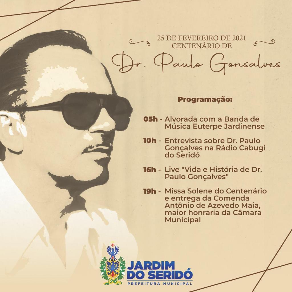 Amanhã (25), a cidade de Jardim do Seridó, através da prefeitura municipal presta justa homenagem ao Dr. Paulo Gonçalves, numa programação que começa às 5h com alvorada com a banda de música Euterpe Jardinense, às 10h tem programação especial na Rádio Cabugi do Seridó, às 16h tem live “A vida e História de Dr. Paulo Gonçalves” e às 19h tem missa solene do Centenário e entrega da comenda Antônio de Azevedo Maia, maior honraria da Câmara Municipal.