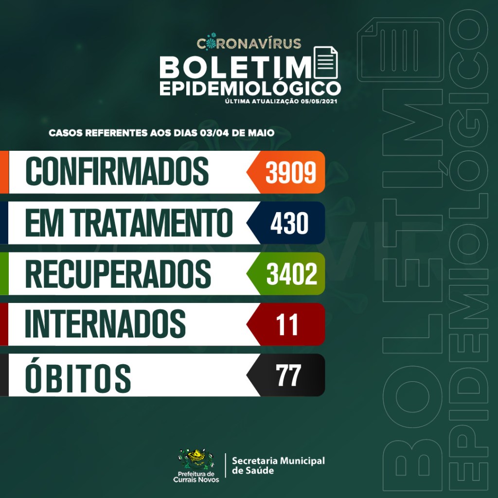 A Secretaria Municipal de Saúde, através da Vigilância Epidemiológica, confirma na manhã desta quarta-feira (05), mais cento e nove (109) novos casos registrados nos dias 03 e 04 de maio, totalizando 3909 casos de Covid19 no município de Currais Novos.