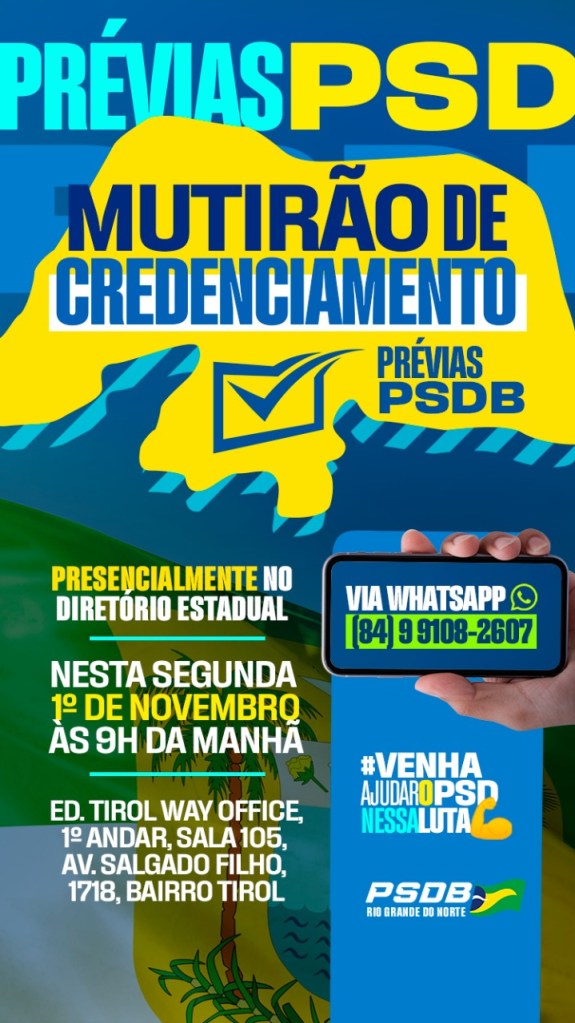 Os filiados do PSDB têm até o próximo dia 14 de novembro para se cadastrar no aplicativo das prévias. A eleição interna acontecerá dia 21 e todos os filiados até maio desde ano podem participar. O PSDB do Rio Grande do Norte realiza nesta segunda-feira (1º), na sede do partido no bairro Tirol, grande Mutirão de Credenciamento para auxiliar os filiados a se registrarem no aplicativo.