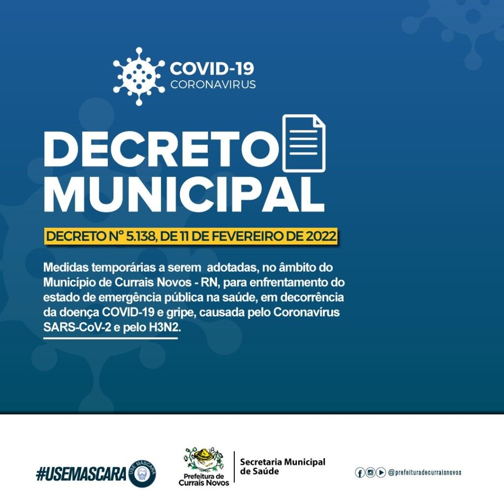 A Prefeitura de Currais Novos publicou na edição desta segunda-feira (14), no Diário Oficial dos Municípios, o Decreto n. 5.138, de 11 de fevereiro de 2022, dispondo sobre novas medidas temporárias de prevenção ao contágio pelo novo coronavírus (COVID-19) no âmbito do Poder Executivo Municipal.