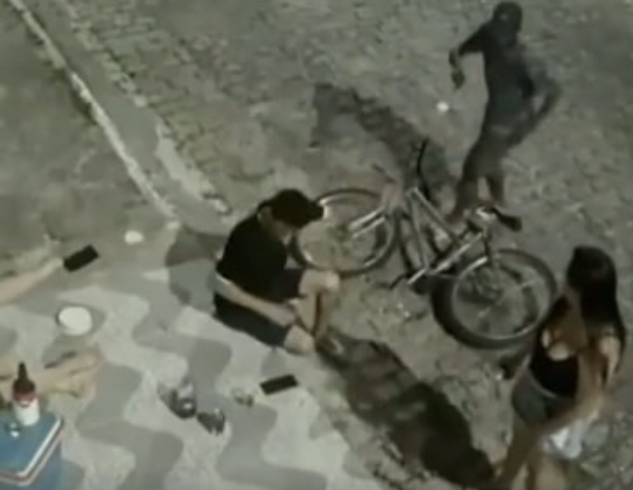 Um bandido em uma bicicleta assaltou funcionários de um restaurante que estavam em seu horário de descanso bebendo em uma calçada em Natal. Imagens das câmeras de segurança flagraram o momento em que o criminoso aborda as pessoas e leva os celulares.