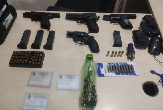 Na residência, os PMs encontraram três armas de fogo, um simulacro de arma de fogo e uma grande quantidade de munições. Os dois envolvidos e os materiais foram encaminhados para a Central de Flagrantes.