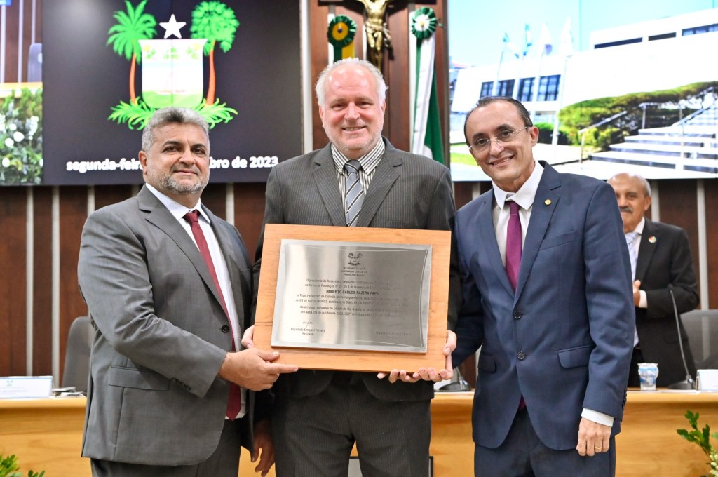 A Assembleia Legislativa do Rio Grande do Norte homenageou, na tarde desta segunda-feira (9), o agrônomo e auditor fiscal Federal Agropecuário do Ministério da Agricultura, Pecuária e Abastecimento Roberto Carlos Razera Papa. Ele recebeu o titulo de Cidadão Norte-Rio-Grandense, que havia sido aprovado pelo Poder Legislativo em 2019. A iniciativa da solenidade foi do mandato do deputado Ivanílson Oliveira (União Brasil).