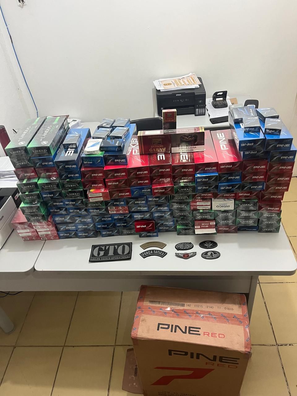 Durante a fiscalização, os policiais visualizaram maços de cigarros de origem estrangeira no interior do veículo, motivo pelo qual foi realizada uma revista minuciosa, sendo encontrada quantidade significativa de cigarros importados de marcas proibidas de comercialização em território nacional.