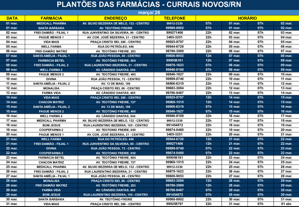 Mar 24 2026 Imagem RELAÇÃO DE FARMACIAS DE PLANTÃO EM MARÇO DE 2026 Compartilhar: Share on X (Abre numa nova janela) X Partilhar no Facebook (Abre numa nova janela) Facebook Share on WhatsApp (Abre numa nova janela) WhatsApp Relacionado