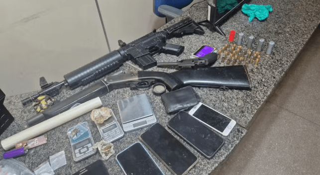 Entre as armas apreendidas, havia uma espingarda calibre 12, um revolver calibre 38, um simulacro de fuzil e munições, além de máscaras, roupas camufladas e drogas.
